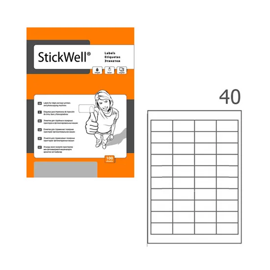 Самоклеящиеся этикетки А4 StickWell. Размер этикетки 48.5 x 25.4 мм. 40 этикеток на листе. В упаковке 100 листов. Этикетки 'StickWell' на листах формата А4 по 100 листов в пачке предназначены для печати на обычных лазерных и струйных принтерах в условиях офиса. Это очень удобно при необходимости получения небольших тиражей этикеток (наклеек). Чаще всего применяются в качестве адресных наклеек на конверты и при идентификации импортного товара при отсутствии надписей на русском языке на заводских упаковках, к чему обязывает российское законодательство.