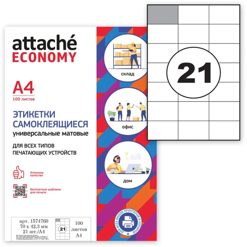 Самоклеящиеся универсальные этикетки Attache Economy рекомендованы для профессиональных и высокоскоростных принтеров (свыше 30 стр/мин). Для персональных и низкоскоростных принтеров (до 20 стр/мин) рекомендуется полистная подача в печать. Не рекомендуется использование на ПВХ поверхностях. Для оформления и печати этикеток удобно использовать шаблон. Для того чтобы увидеть разлиновку шаблона, необходимо в ПО Word открыть вкладку «Макет» и щелкнуть «Отобразить сетку». Для удобства работы с рисунками: выделить вставленный в шаблон рисунок левой кнопкой мыши, открыть вкладку «Формат» и выбрать режим «Обтекание текстом — По контуру». Также можно самостоятельно сформировать шаблон в ПО Word.