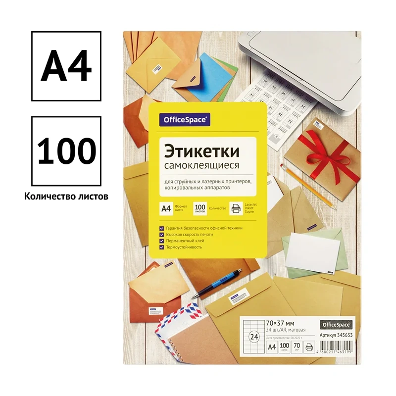 Этикетки самоклеящиеся OfficeSpace предназначены для многофункционального информационного этикетирования, например, адресные этикетки на конверты, ценники на товары, штрихкоды, информационные сообщения. В упаковке 100 листов формата А4 плотностью 70 г/м2, количество фрагментов – 24 (70*37 мм). Этикетки самоклеящиеся OfficeSpace и лазерных принтеров, копировальных аппаратов. Перед загрузкой в оргтехнику рекомендуется пролистывать бумагу с четырех сторон.