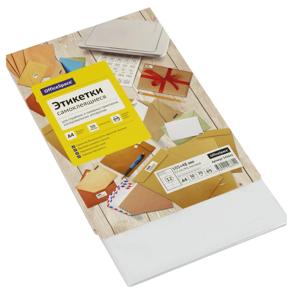 Этикетки самоклеящиеся OfficeSpace предназначены для многофункционального информационного этикетирования, например, адресные этикетки на конверты, ценники на товары, штрихкоды, информационные сообщения. В упаковке 50 листов формата А4 плотностью 70 г/м2, количество фрагментов – 12 (105*48 мм). Этикетки самоклеящиеся OfficeSpace и лазерных принтеров, копировальных аппаратов. Перед загрузкой в оргтехнику рекомендуется пролистывать бумагу с четырех сторон.