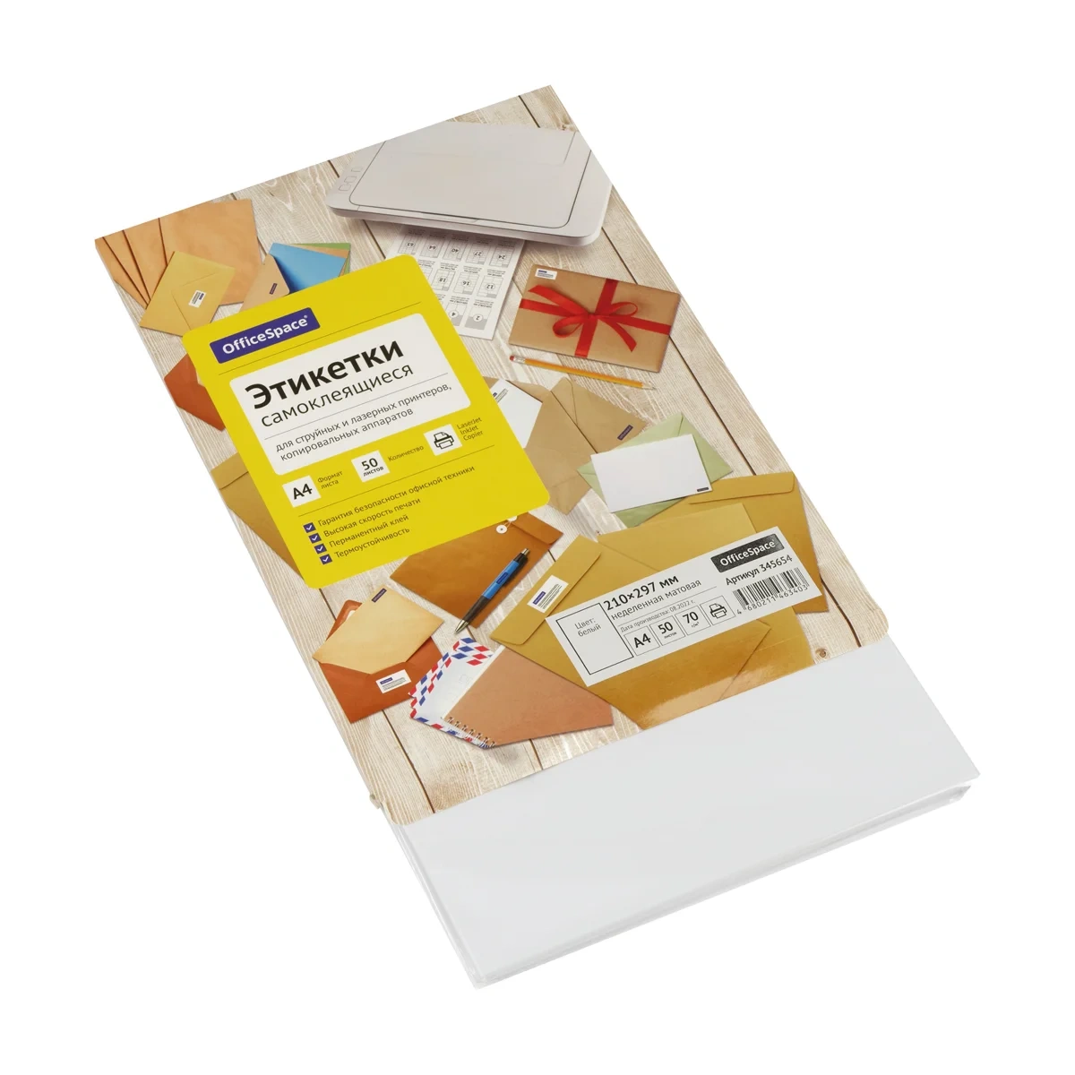 Этикетки самоклеящиеся OfficeSpace предназначены для многофункционального информационного этикетирования, например, адресные этикетки на конверты, ценники на товары, штрихкоды, информационные сообщения. В упаковке 50 неделённых листов формата А4 плотностью 70 г/м2. Этикетки самоклеящиеся OfficeSpace и лазерных принтеров, копировальных аппаратов. Перед загрузкой в оргтехнику рекомендуется пролистывать бумагу с четырех сторон.