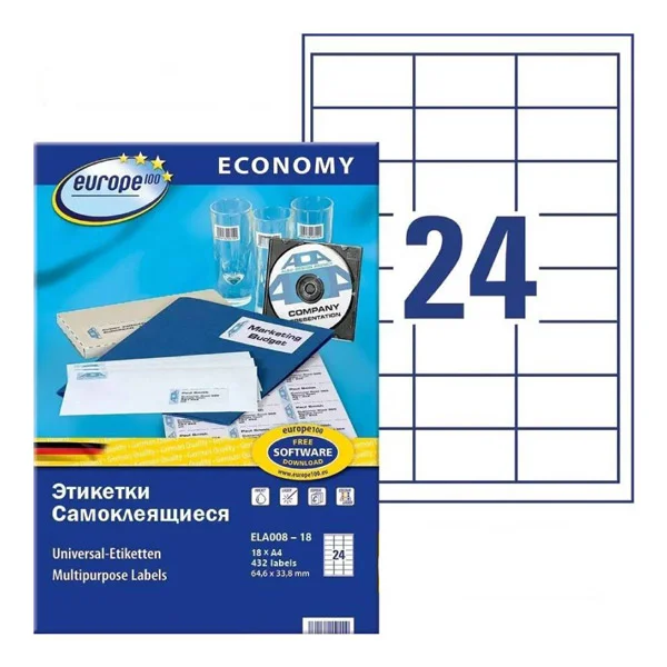 Самоклеящиеся этикетки Europe-100 ELA008-18: размер этикетки 64,6 х 33,7 мм, 24 этикетки на листе А4, в упаковке 18 листов.