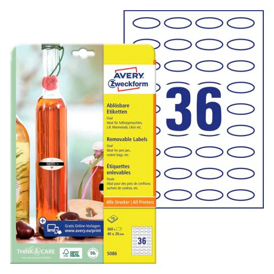 Удаляемые овальные этикетки 5086 от AVERY ZWECKFORM (40х20мм) идеально подходят для маркировки домашних заготовок, таких как джемы, варенье, бутылки с ликерами или настойками, упаковки с домашней выпечекой. В упаковке 360 этикеток на 10 листах. Наклейки надежно приклеиваются на стеклянную поверхность, пленку и бумагу и легко удаляются, не оставляя следов клея на поверхности. Надежная печать без застреваний.