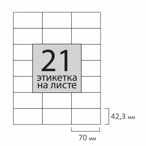 Выполнены из самоклеящейся матовой бумаги плотностью 65 г/м2. Надежно приклеиваются к поверхности любой формы и материала. Ширина этикетки составляет 42,3 мм, длина - 70 мм. Комплект из 100 листов по 21 штуке является выгодным приобретением для любой организации.