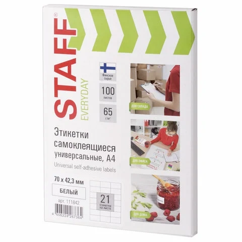 Этикетки самоклеящиеся Staff Everyday 70х42.3мм, белые, 21шт на листе А4, 100 листов