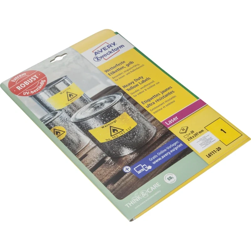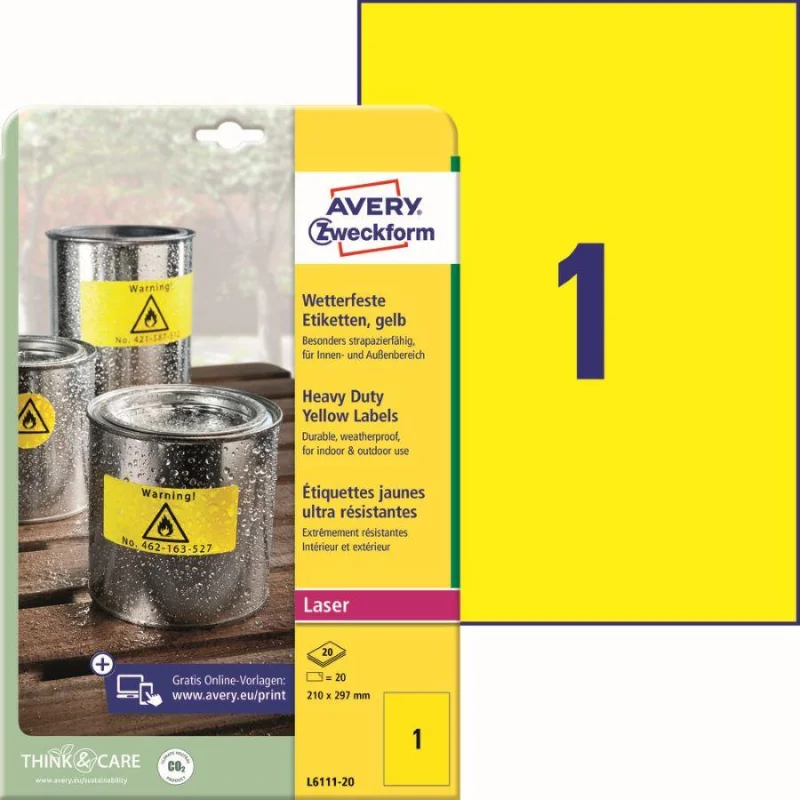 Этикетки самоклеящиеся всепогодные Avery Zweckform. Хороший вариант для маркировки в экстремальных условиях, где бумага справиться не способна. Надежный клеевой состав. Этикетки надежно приклеиваются на различные поверхности. Особо прочные этикетки устойчивы к воздействию загрязняющих веществ, влаги, перепадов температуры ( от -20C до + 80C). Маслостойкие, моющиеся, грязеотталкивающие. Гарантия беспрепятственного прохождения листов через любой принтер. Печать на всех основных лазерных принтерах и копировальных аппаратах. Плотность 75 г/кв.м. Этикетки желтого цвета, 1 этикетка 210х297 мм, на листе А4. В упаковке 20 листов.Для оформления и печати этикеток удобно использовать шаблон. Подложка по данным этикеткам имеет поперечную просечку по короткой стороне. Для того чтобы увидеть разлиновку шаблона, необходимо в ПО Word открыть вкладку «Макет» и щелкнуть «Отобразить сетку». Для удобства работы с рисунками: выделить вставленный в шаблон рисунок левой кнопкой мыши, открыть вкладку «Формат» и выбрать режим «Обтекание текстом — По контуру».Также можно самостоятельно сформировать шаблон в ПО Word.Пошаговая инструкция по созданию этикеток в ПО Word:1. Откройте текстовый редактор Word, в верхней горизонтальной строке рабочего окна щелкните стрелкой мыши «Сервис», в открывшемся перечне щелкните «Конверты и наклейки» (для Microsoft Word XP — «Письма и рассылки», а затем «Конверты и наклейки»).2. В открывшемся окне «Конверты и наклейки» щелкните «Наклейки», затем в перечне справа щелкните «Параметры». Выберите тип принтера и вариант подачи бумаги.3. В окне «Параметры наклейки» щелкните «Создать». Появится окно, в нижней части которого — окошки для данных о выбранной вами этикетке.4. Введите данные об этикетках: величину верхнего поля, боковых полей и т.д. В окошке «Тип» введите размер этикетки или название, которое вы ей присвоите. (Указанные параметры можно узнать в инструкции, идущей в комплекте с этикетками.) Завершите настройку щелчком «ОК».Данные для печати этикеток в ПО Word: Размер этикетки, см: 21.0×29.7; Кол-во этикеток на листе: 1; Верхнее поле, см: 0; Боковые поля, см: 0; Шаг по вертикали, см: 26.69; Шаг по горизонтали, см: 20; Высота наклейки, см: 26.69; Ширина наклейки, см:20.0; Число наклеек по горизонтали: 1; Число наклеек по вертикали: 1.5. Закройте окно «Параметры наклейки» (вкладка «Настройка»), нажав «ОК», после чего активизируется окно «Конверты и наклейки».6. В светлой прямоугольной ячейке окна «Конверты и наклейки» соразмерно формату этикетки один раз введите текст, который компьютер автоматически разместит на всех этикетках листа. Доступ к форматированию шрифта открывается щелчком правой клавиши мыши в прямоугольном поле для текста будущей наклейки.7. Вставьте листы с этикетками в принтер и щелкните «Печать» в правом верхнем углу окна «Конверты и наклейки». Для дальнейшей работы с этикетками щелкните «Создать» и сохраните файл как обычный документ редактора Microsoft Word. Сохраненный файл вы можете использовать в качестве шаблона для создания новых этикеток такого же формата.Для оформления и печати этикеток так же удобно использовать фирменное программное обеспечение от Avery Zweckform. С его помощью возможно как простое редактирование текста на этикетке, так и создание креативных проектов и сложных дизайнов. Возможности программы: вставка картинок и объектов, импорт баз д