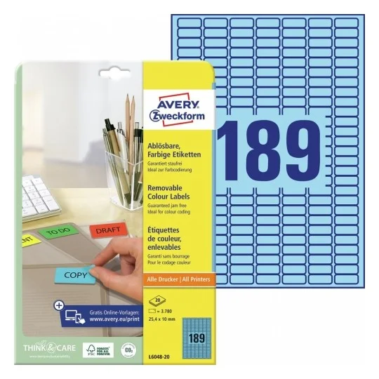 Этикетки цветные Avery Zweckform L6048-20, синие, 25.4х10мм, 189шт на листе А4, 20 листов