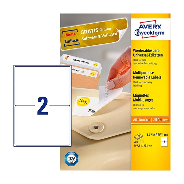 Этикетки удаляемые Avery Zweckform L4734REV-100, белые, 199.6х143.5мм, 2шт на листе А4, 100 листов
