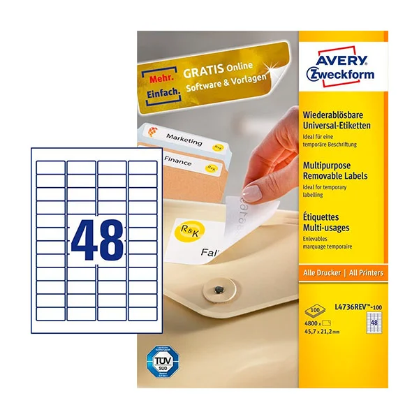 Этикетки удаляемые Avery Zweckform L4736REV-100, белые, 45.7х21.2мм, 48шт на листе А4, 100 листов