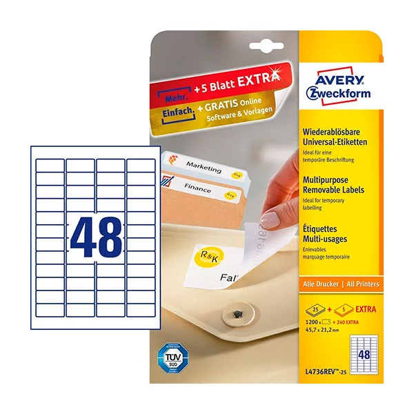 Этикетки удаляемые Avery Zweckform L4736REV-25, белые, 45.7х21.1мм, 48шт на листе А4, 30 листов