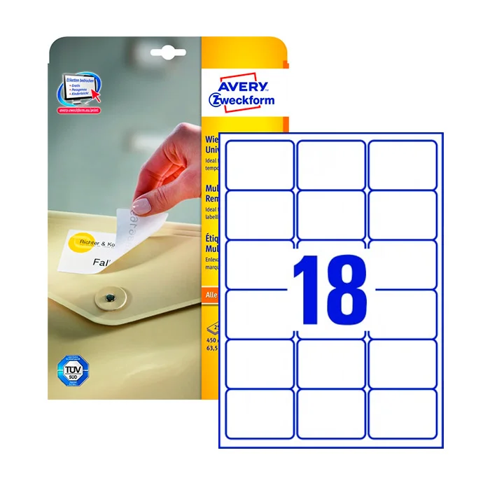 Этикетки удаляемые Avery Zweckform L6025REV-25, белые, 63.5х46.6мм, 18шт на листе А4, 30 листов
