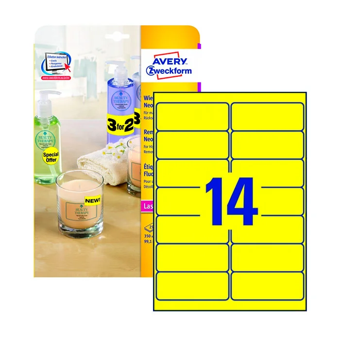 Этикетки удаляемые Avery Zweckform L7263Y-25, желтые неоновые, 99.1x38.1мм, 14шт на листе А4, 25 листов
