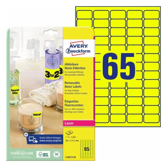 Этикетки удаляемые Avery Zweckform L7651Y-25, желтые неоновые, 38х21.2мм, 65шт на листе, 25 листов