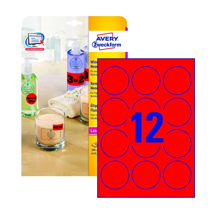 Этикетки удаляемые Avery Zweckform L7670R-25, красные неон, d=63.5мм, 12шт на листе А4, 25 листов