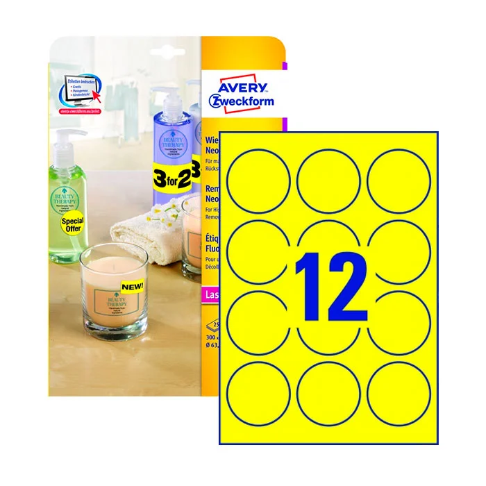 Этикетки удаляемые Avery Zweckform L7670Y-25, желтые неон, d=63.5мм, 12шт на листе А4, 25 листов