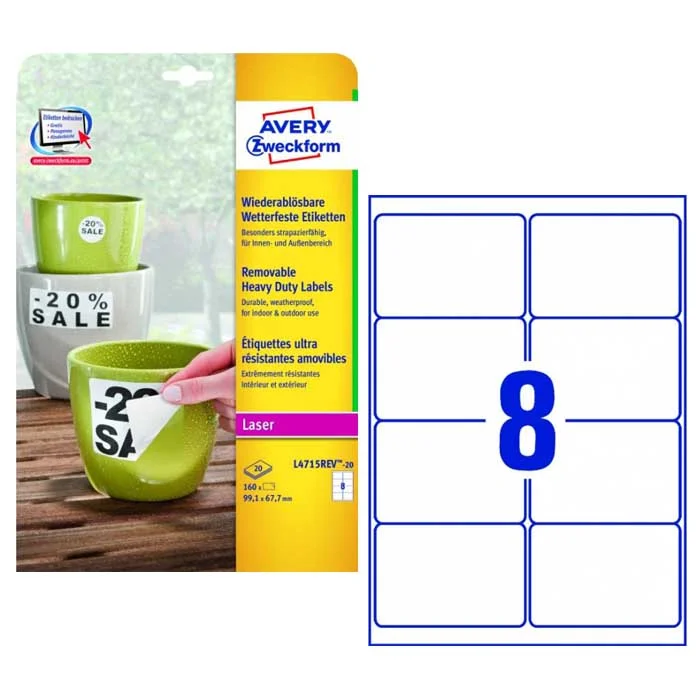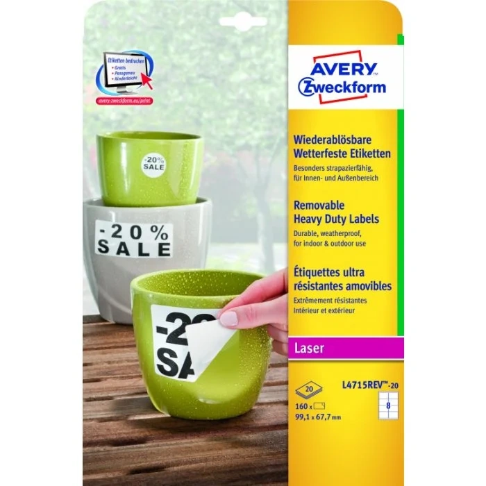 Всепогодные удаляемые этикетки от Avery Zweckform предназначены для печати на лазерных принтерах. Они более стойкие, чем обычные бумажные этикетки. Масло-и-УФ-стойкие, грязеотталкивающие, устойчивы к перепадам теператур (от-20 С до +80 С), водостойкие, экстрапрочные этикетки подходят для использования на улице. Надежный клей, однако этикетка удаляется без следов. Идеальное решение для современной рекламы, оклеивания предметов собственности, а также для часто меняющейся информации в складских помещениях.