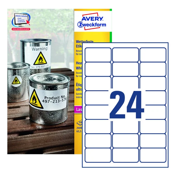 Этикетки всепогодные Avery Zweckform L4773-100, белые, 63.5х33.9мм, 24шт на листе А4, 100 листов
