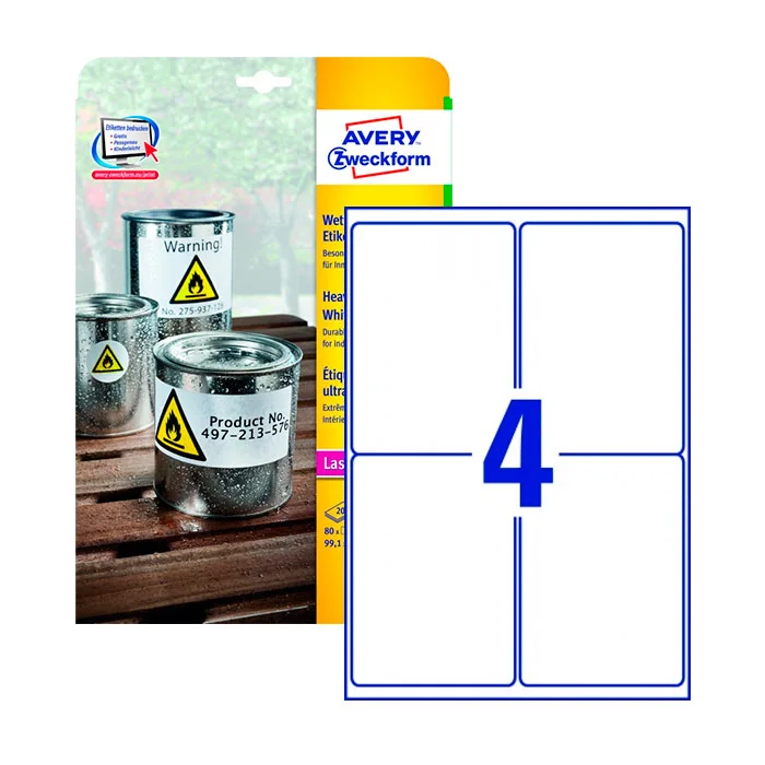 Этикетки всепогодные Avery Zweckform L4774-20, белые, 99.1x139мм, 4шт на листе А4, 20 листов