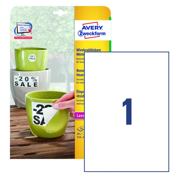 Этикетки всепогодные Avery Zweckform L4775REV-20, белые, 210х297мм, 1шт на листе А4, 20 листов