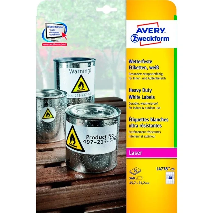 Этикетки всепогодные Avery Zweckform L4778-20, белые, 45.7х21.2мм, 48шт на листе А4, 20 листов