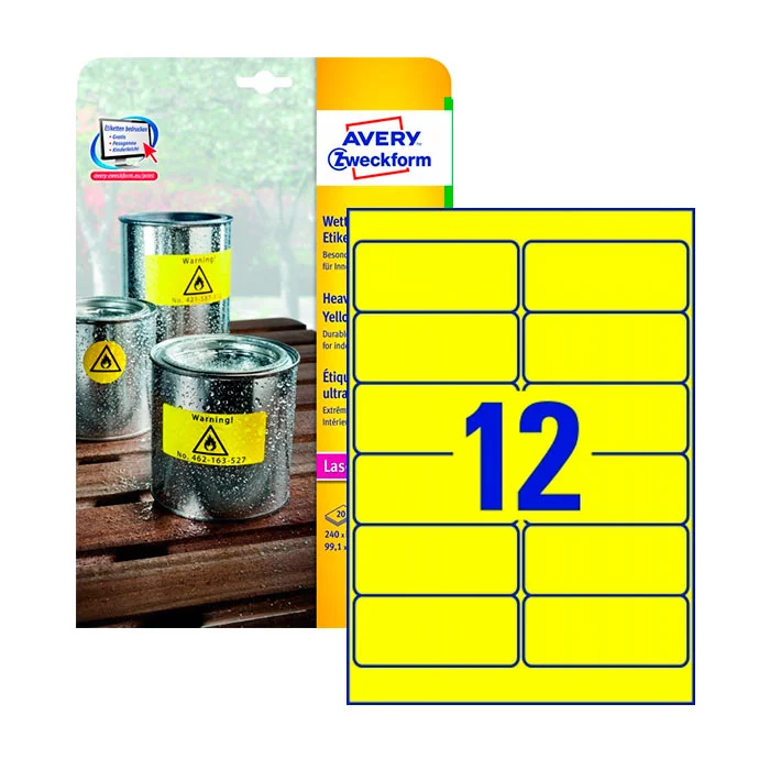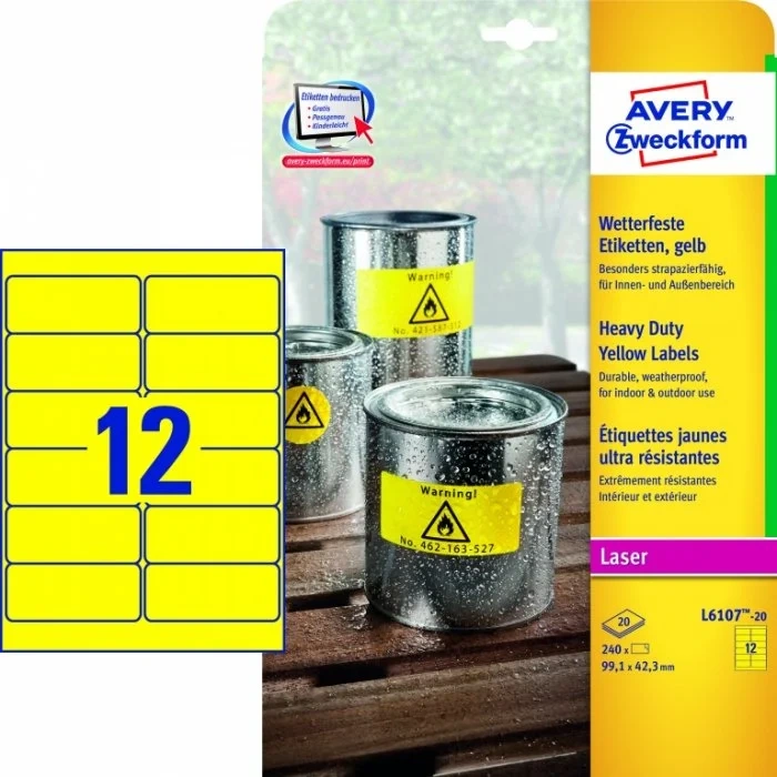Этикетки всепогодные Avery Zweckform L6107-20, желтые, 99.1х42.3мм, 12шт на листе А4, 20 листов
