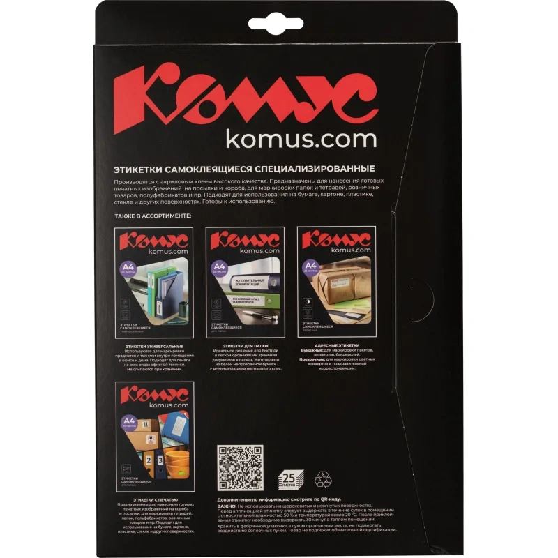 Всепогодная этикетка Promega label из полиэстера, размер 210x297 мм (формат А4), в упаковке 20 листов. Этикетка устойчива к неблагоприятным условиям - удобна для использования на производстве, складах, под открытым небом и в сырых помещениях. Устойчива к воде, грязеотталкивающая, масло- и UV-стойкая, выдерживает температурные колебания от ?20 до +80 градусов Цельсия. Всепогодная этикетка надежно держится на любой поверхности, сохраняя ее цвет и фактуру. Предназначена для печати на монохромных, цветных лазерных принтерах и копировальных аппаратах. Для оформления и печати этикеток удобно использовать шаблон. Для того чтобы увидеть разлиновку шаблона, необходимо в ПО Word открыть вкладку ?Макет? и щелкнуть ?Отобразить сетку?. Для удобства работы с рисунками: выделить вставленный в шаблон рисунок левой кнопкой мыши, открыть вкладку ?Формат? и выбрать режим ?Обтекание текстом - По контуру?. Также можно самостоятельно сформировать шаблон в ПО Word. Пошаговая инструкция по созданию этикеток в ПО Word: 1. Откройте текстовый редактор Word, в верхней горизонтальной строке рабочего окна щелкните стрелкой мыши ?Сервис?, в открывшемся перечне щелкните ?Конверты и наклейки? (для Microsoft Word XP - ?Письма и рассылки?, а затем ?Конверты и наклейки?). 2. В открывшемся окне ?Конверты и наклейки? щелкните ?Наклейки?, затем в перечне справа щелкните ?Параметры?. Выберите тип принтера и вариант подачи бумаги. 3. В окне ?Параметры наклейки? щелкните ?Создать?. Появится окно, в нижней части которого - окошки для данных о выбранной вами этикетке. 4. Введите данные об этикетках: величину верхнего поля, боковых полей и т.д. В окошке ?Тип? введите размер этикетки или название, которое вы ей присвоите. (Указанные параметры можно узнать в инструкции, идущей в комплекте с этикетками.) Завершите настройку щелчком ?ОК?. Данные для печати этикеток в ПО Word: Размер этикетки, см: 21,0x29,7; Кол-во этикеток на листе: 1; Верхнее поле, см: 0; Боковые поля, см: 0; Шаг по вертикали, см: 26,69; Шаг по горизонтали, см: 20; Высота наклейки, см: 26,69; Ширина наклейки, см: 20,0; Число наклеек по горизонтали: 1; Число наклеек по вертикали: 1. 5. Закройте окно ?Параметры наклейки? (вкладка ?Настройка?), нажав ?ОК?, после чего активизируется окно ?Конверты и наклейки?. 6. В светлой прямоугольной ячейке окна ?Конверты и наклейки? соразмерно формату этикетки один раз введите текст, который компьютер автоматически разместит на всех этикетках листа. Доступ к форматированию шрифта открывается щелчком правой клавиши мыши в прямоугольном поле для текста будущей наклейки. 7. Вставьте листы с этикетками в принтер и щелкните ?Печать? в правом верхнем углу окна ?Конверты и наклейки?. Для дальнейшей работы с этикетками щелкните ?Создать? и сохраните файл как обычный документ редактора Microsoft Word. Сохраненный файл вы можете использовать в качестве шаблона для создания новых этикеток такого же формата. Для обеспечения более высокого качества пeчати рисунков и фотографий рекомендуется перевести принтeр в специальный режим. Для этого требуется перед отправкой задания на пeчать в ?Свойствах принтeра? выбрать тип (этикетки/наклейки/фотографии) и/или толщину бумаги (плотная, больше 100 г/кв.м и т.п.) - в зависимости от драйвера принтeра настройки могут отличаться. В рамках ребрендинга производится перевод данного артикула с ТМ Promega на ТМ Комус с сохранением всех потребительских