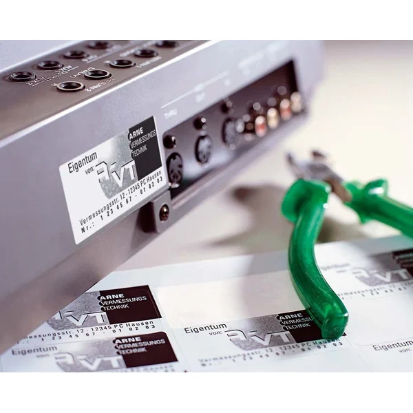 Серебристые этикетки для табличек с паспортными данными обладают следующими свойствами: термостойкость от -20 до + 80°C, масло-, водо- и УФ-стойкие, а также особо прочные.