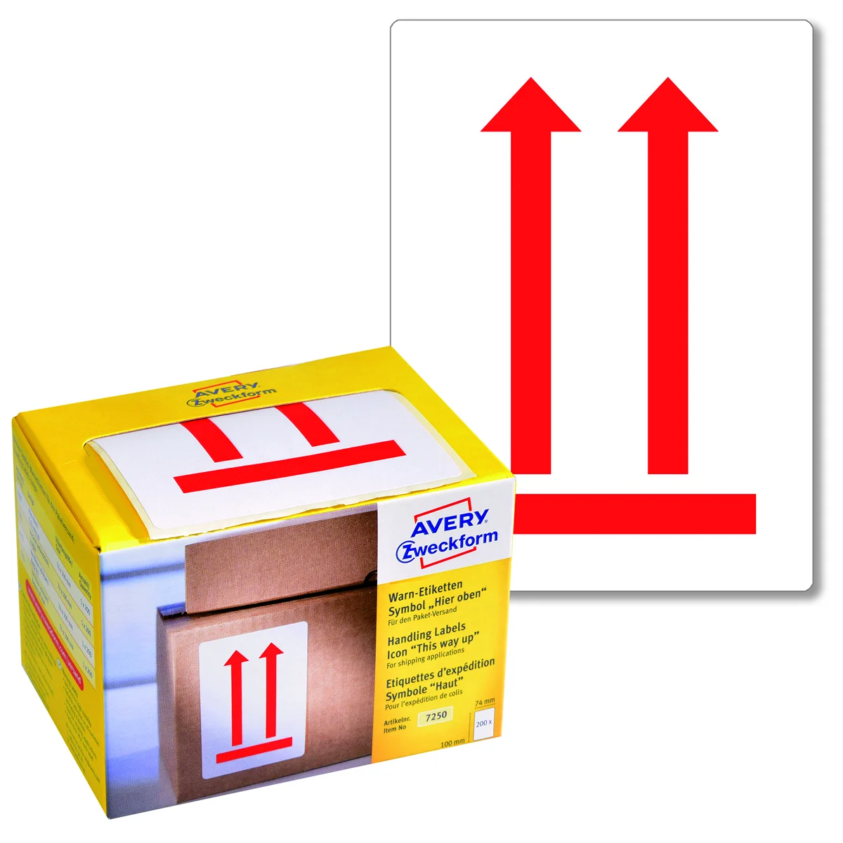 Напечатанные предупреждающие этикетки с пиктограммой 'Держать строго вверх' (две стрелочки вверх), размер 78х100мм. Предупреждающие знаки идеально подходят для маркировки посылок и упаковки при международной пересылке. 200 этикеток в рулоне в практичном диспенсере из надежного картона. Пиктограммы яркого цвета, мгновенно привлекают внимание к упаковке. Специально разработанный клеевой состав надежно приклеивается к стандартным упаковочным материалам, таким как конверты, коробки, пленки и др. Благодаря перфорации после каждой предупреждающей этикетки процесс обработки большого количества отправок становится быстрее и легче, особенно в крупных транспортных компаниях. Картонный диспенсер очень удобен в использовании и хранении. Выбирайте надежное и проверенное качество от Avery Zweckform!