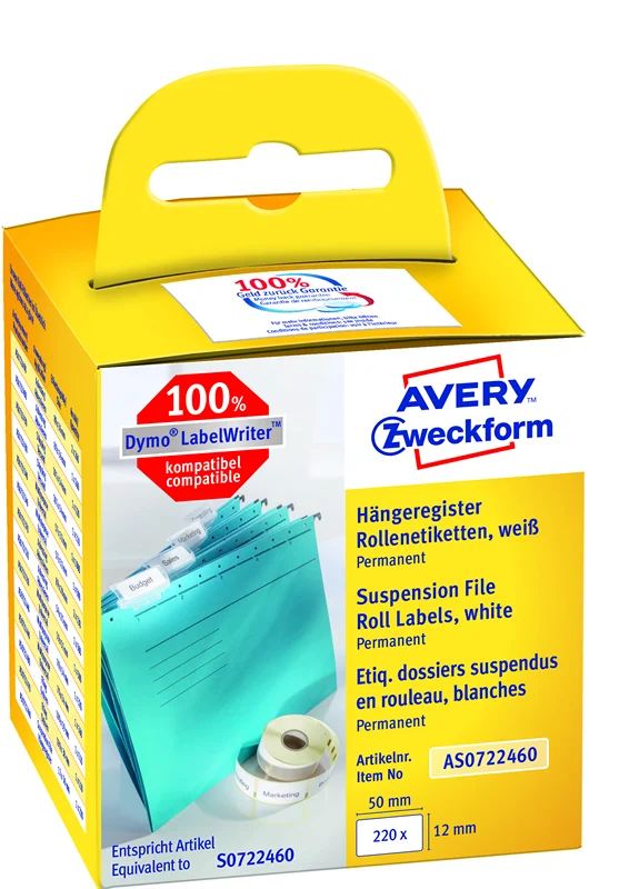 Белые универсальные этикетки в ролях с надежным клеем AS0722460, размер 12x50мм идеально подходят для маркировки подвесных папок и архивов. Этикетки для подвесных папок 100% совместимы с ленточными принтерами Dymo Labelwriter модели LW310, LW330T, LW400, а также LW450. Данные этикетки соответствуют этикеткам Dymo арт. S0722460. 220 этикеток в упаковке. Ролевые этикетки с надежным клеевым составом прошли испытания (тест на адгезию FTM2 и FTM9 на стандартных поверхностях), а также имеют сертификацию FSC , не содержат бисфенол А (BPA). Этикетки легко оформить и распечатать с помощью программного обеспечения Dymo