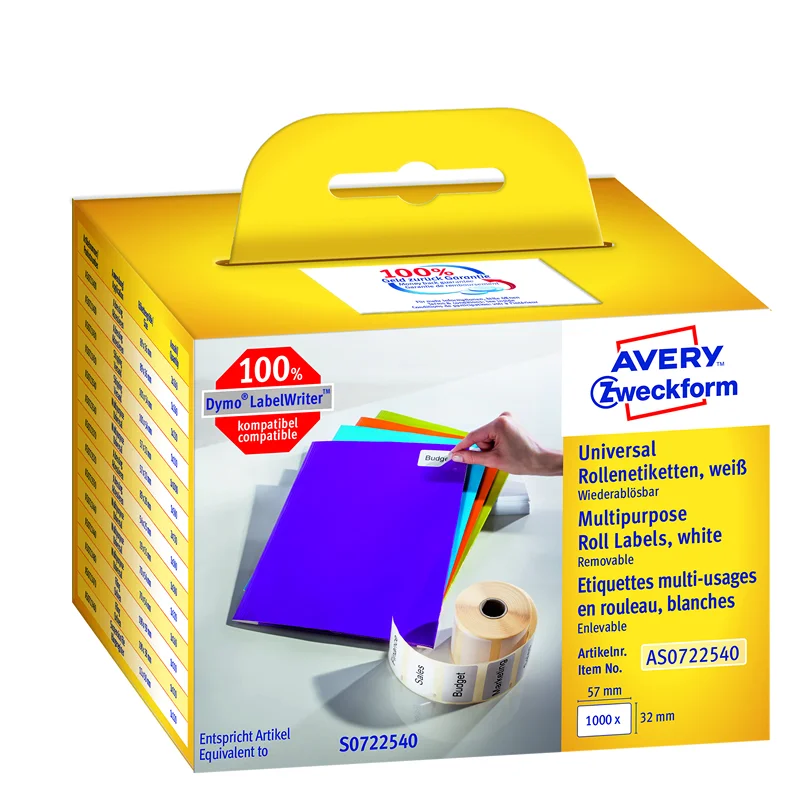 Универсальные удаляемые этикетки в ролях AS0722540 в ролях с надежным клеевым составом, совместимы с ленточными принтерами Dymo Labelwriter модели LW310, LW330T, LW400, а также LW450. Данные этикетки соответствуют этикеткам Dymo арт. S0722540.