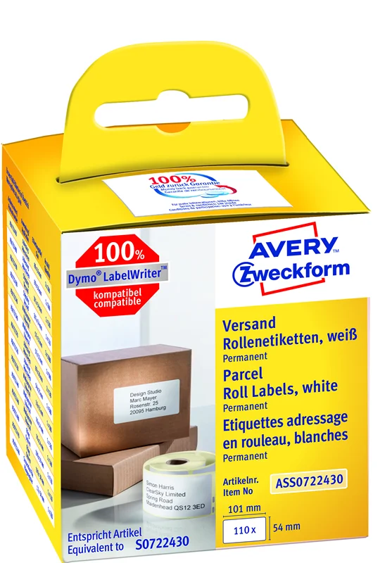 Белые этикетки в ролях с надежным клеем ASS0722430, размер 54 x101 мм идеально подходят для маркировки упаковки и почтовой рассылки. Адресные этикетки 100% совместимы с ленточными принтерами Dymo Labelwriter модели LW310, LW330T, LW400, а также LW450 и с принтерами Seiko Smart LabelPrinter. Данные этикетки соответствуют этикеткам Dymo арт. S0722430/Seiko арт. SLP-SRL. Размер упаковки: по 110 этикеток в упаковке. Ролевые этикетки с надежным клеевым составом прошли испытания (тест на адгезию FTM2 и FTM9 на стандартных поверхностях), а также имеют сертификацию FSC , не содержат бисфенол А (BPA). Адресные этикетки легко оформить и распечатать с помощью программного обеспечения Dymo или Seiko.