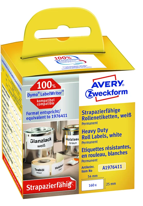 Всепогодные этикетки в ролях A1976411, размер 25 x 54мм идеальны для указателей и предупреждающих знаков, для маркировки на складе, на производстве, в мастерской. Этикетки 100% совместимы с ленточными принтерами Dymo Labelwriter (модели LW330T, LW400 и модель LW450 ). 160 этикеток в роле/ уп. Этикетки водостокие, грязе -и -маслостойкие, устойчивы к перепадам температур (от -20°C до +60°C), а также к чистящим средствам. Легко оформить и распечатать с помощью ПО Dymo.