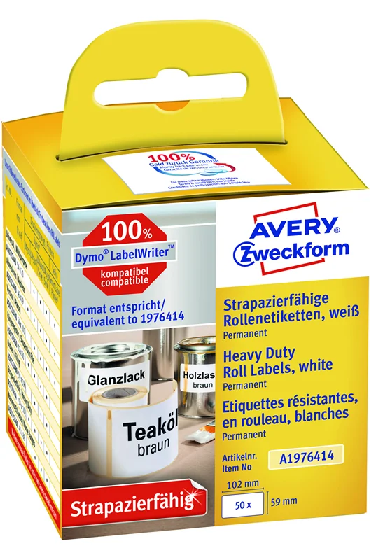 Всепогодные этикетки в ролях A1976414, размер 59 x 102мм идеальны для указателей и предупреждающих знаков, для маркировки на складе, на производстве, в мастерской. Этикетки 100% совместимы с ленточными принтерами Dymo Labelwriter (модели LW330T, LW400 и модель LW450 ). 50 этикеток в роле/ уп. Этикетки водостокие, грязе -и -маслостойкие, устойчивы к перепадам температур (от -20°C до +60°C), а также к чистящим средствам. Важно: Избегайте длительного контакта с чистящими стредстквами. Оформить и распечатать ролевые этикетки Avery Zweckform легко и быстро с помощью программного обеспечения Dymo. В связи с термопроцессами ленточного принтера этикетки не устойчивы УФ- лучам. Избегайте прямых солнечных лучей, иначе этикетка обесцветится.