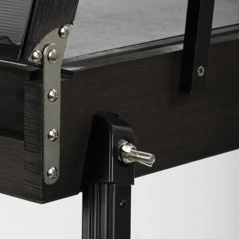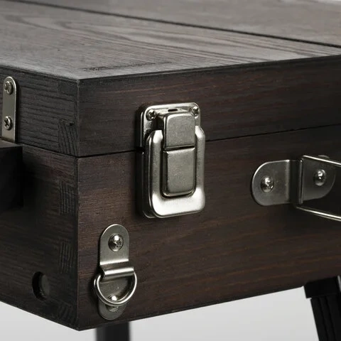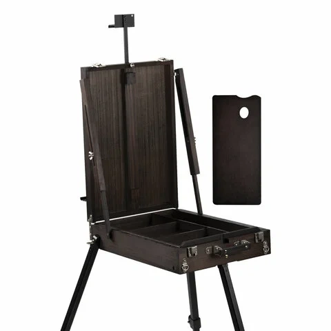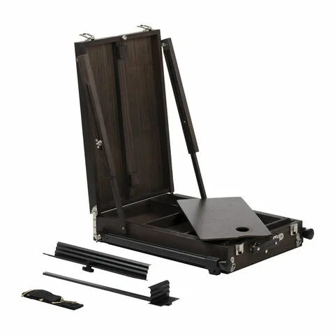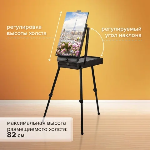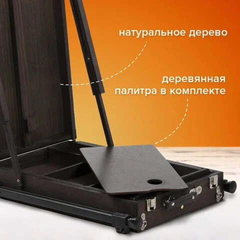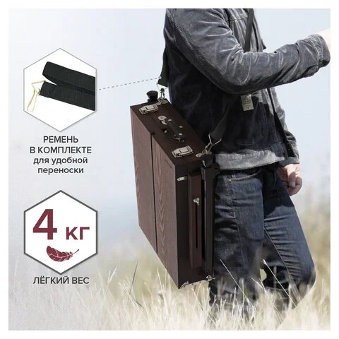 Изготовлен из сосны с применением качественной фурнитуры. Оснащен ящиком для хранения кистей и палитрой для красок. Этюдник позволяет комфортно работать как сидя, так и стоя благодаря съемным телескопическим ножкам длиной 90 см и регулирующему наклону холста с его максимальной высотой до 82 см. Для удобства переноски имеется регулируемый тесемный ремень.