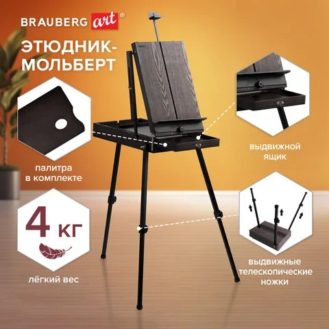 Этюдник-мольберт BRAUBERG ART PREMIERE, алюминиевые ножки, холст до 82 см, кофейный, 191757