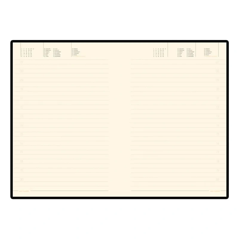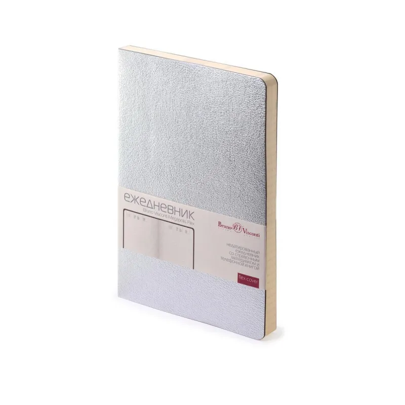 Ежедневник недатированный Bruno Visconti с элегантной закруглённой flex-обложкой из гладкого кожзама, которая имеет гибкую конструкцию. Интегральный переплёт позволяет сэкономить место в рабочей сумке или портфеле — ежедневник можно просто свернуть в трубку или согнуть пополам. Недатированный ежедневник формата A5 (140×210 мм) содержит 272 страницы. Для них используется качественный бежевый офсет повышенной плотности (70 г/кв.м). Блок не привязан к конкретным датам — они указываются в выделенном поле вверху страницы.