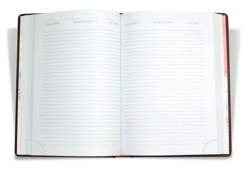Материал обложки — Brand, оранжевый ОО. недатированный. Кол-во страниц — 336; Бумага — белая, плотность 70 г/м; Форзац и нахзац — карты России и Европы.