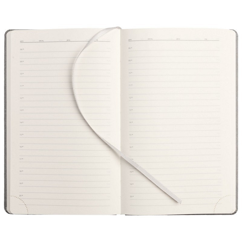 Ежедневник с твердой обложкой, выполнен из материала Brand, серый СС, дополнен резинкой и ляссе в цвет обложки. Блок 955:Кол-во страниц — 192; Бумага — тонированная, плотность 70 г/м; Форзац и нахзац — тонированные. Шильда на резинку поставляется отдельно. Услуга сборки добавляет к сроку выполнения заказа 3 рабочих дня. От сборки можно отказаться, написав об этом в примечании к заказу.