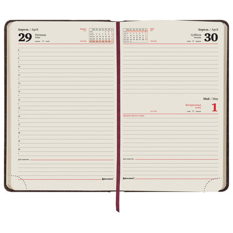 Внутренний блок включает 168 листов тонированной бумаги цвета 'слоновая кость' плотностью 70 г/м2. Каждая страничка имеет перфорированный угол. Благодаря стандартному формату А5 (138х213 мм) ежедневник удобно использовать как в офисе, так и на выездных деловых встречах. Твердая обложка состоит из двух материалов и стилизована под кожу крокодила в сочетании с гладкой кожей. Подходит для горячего тиснения. Срез ежедневника фольгирован золотой фольгой, что придает ему особый шарм. Форзац ежедневника представлен картами мира и России. Дополнением является закладка-ляссе, с помощью которой при необходимости можно быстро открыть ежедневник на нужной странице. Помимо прочего, ежедневник снабжен обширным справочным материалом. Выполнен в стильном сочетании коричневого и черного цветов.