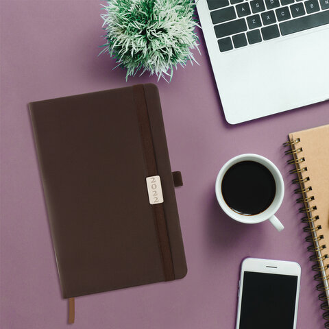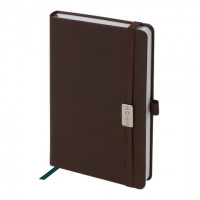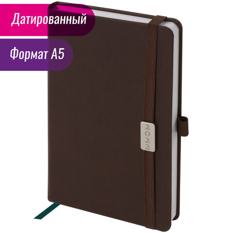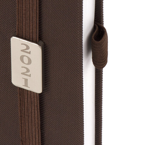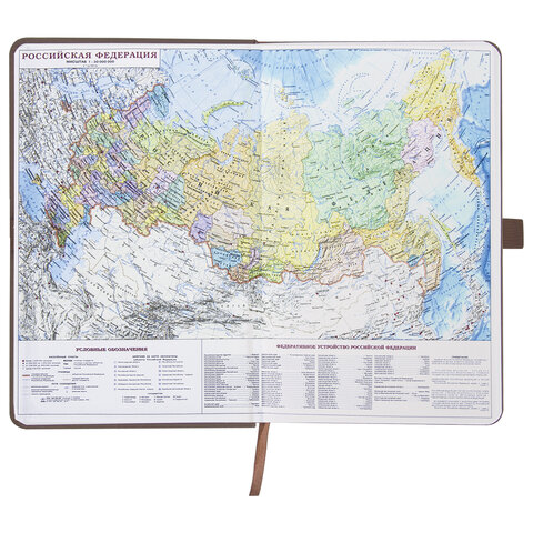 Внутренний блок включает 168 листов белой бумаги плотностью 70 г/м2. Каждая страничка имеет перфорированный угол. Благодаря стандартному формату А5 (138х213 мм) ежедневник удобно использовать как в офисе, так и на выездных деловых встречах. Жесткая книжная обложка благородного коричневого цвета стилизована под искусственную кожу с мелким рисунком, фиксируется резинкой, поэтому ежедневник не откроется в сумке или портфеле и страницы не помнутся. Материал обложки подходит для горячего тиснения. Для удобства пользования ежедневник снабжен держателем для фиксации ручки. Форзац ежедневника представлен картами мира и России. Дополнением является закладка-ляссе, с помощью которой при необходимости можно быстро открыть ежедневник на нужной странице. Помимо прочего, ежедневник снабжен обширным справочным материалом.