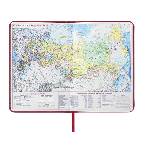 Внутренний блок включает 168 листов белой бумаги плотностью 70 г/м2. Каждая страничка имеет перфорированный угол. Благодаря стандартному формату А5 ежедневник удобно использовать как в офисе, так и на выездных деловых встречах. Обложка с прошивкой по периметру имеет ярко выраженную текстуру под кожу, приятную на ощупь. Материал обложки подходит для горячего тиснения. Форзац ежедневника представлен картами мира и России. Дополнением является закладка-ляссе, с помощью которой при необходимости можно быстро открыть ежедневник на нужной странице. Помимо прочего, ежедневник снабжен обширным справочным материалом.