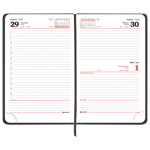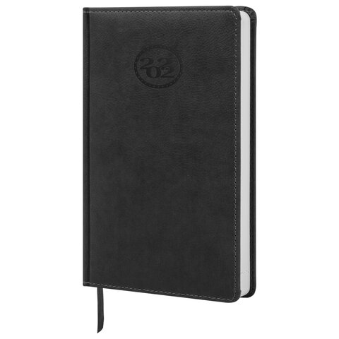 Внутренний блок включает 168 листов белой бумаги плотностью 70 г/м2. Каждая страничка имеет перфорированный угол. Благодаря стандартному формату А5 ежедневник удобно использовать как в офисе, так и на выездных деловых встречах. Обложка с прошивкой по периметру имеет ярко выраженную текстуру под кожу, приятную на ощупь. Материал обложки подходит для горячего тиснения. Форзац ежедневника представлен картами мира и России. Дополнением является закладка-ляссе, с помощью которой при необходимости можно быстро открыть ежедневник на нужной странице. Помимо прочего, ежедневник снабжен обширным справочным материалом. Выполнен в классическом черном цвете.
