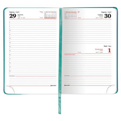 Внутренний блок включает 168 листов белой бумаги плотностью 70 г/м2. Каждая страничка имеет перфорированный угол. Благодаря стандартному формату А5 (138х213 мм) датированный ежедневник удобно использовать как в офисе, так и на выездных деловых встречах. Мягкая (интегральная) обложка яркого бирюзового цвета, под гладкую кожу, имеет декоративное тиснение, что придает ежедневнику особый шарм. Материал обложки подходит для горячего тиснения. Дополнением является закладка-ляссе, с помощью которой при необходимости можно быстро открыть ежедневник на нужной странице. Помимо прочего, ежедневник снабжен обширным справочным материалом.