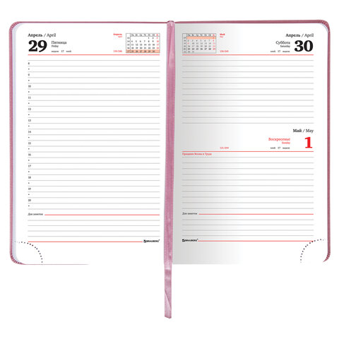 Внутренний блок включает 168 листов белой бумаги плотностью 70 г/м2. Каждая страничка имеет перфорированный угол. Благодаря стандартному формату А5 (138х213 мм) датированный ежедневник удобно использовать как в офисе, так и на выездных деловых встречах. Мягкая (интегральная) обложка, под фактурную кожу розового цвета с легким блеском имеет декоративное тиснение, что придает ежедневнику особый шарм. Материал обложки подходит для горячего тиснения. Дополнением является закладка-ляссе, с помощью которой при необходимости можно быстро открыть ежедневник на нужной странице. Помимо прочего, ежедневник снабжен обширным справочным материалом.