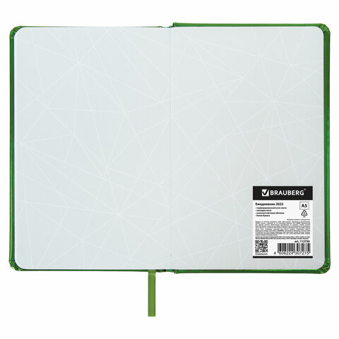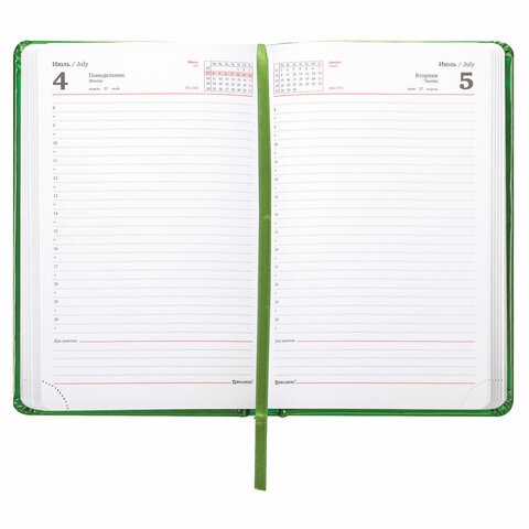 Внутренний блок включает 168 листов белой бумаги плотностью 70 г/м2. Каждая страничка имеет перфорированный угол. Благодаря стандартному формату А5 (138х213 мм) ежедневник удобно использовать как в офисе, так и на выездных деловых встречах. Твердая обложка стилизована под зеркальную кожу насыщенного зеленого цвета. Подходит для горячего тиснения. Дополнением является закладка-ляссе, с помощью которой при необходимости можно быстро открыть ежедневник на нужной странице. Помимо прочего, ежедневник снабжен справочным материалом.