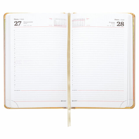 Внутренний блок включает 168 листов белой бумаги плотностью 70 г/м2. Каждая страничка имеет перфорированный угол. Благодаря стандартному формату А5 (138х213 мм) ежедневник удобно использовать как в офисе, так и на выездных деловых встречах. Твердая обложка стилизована под зеркальную кожу благородного золотистого цвета. Подходит для горячего тиснения. Дополнением является закладка-ляссе, с помощью которой при необходимости можно быстро открыть ежедневник на нужной странице. Помимо прочего, ежедневник снабжен справочным материалом.