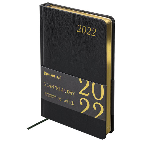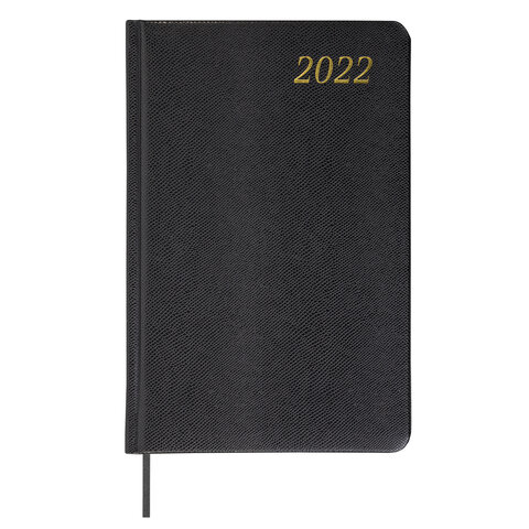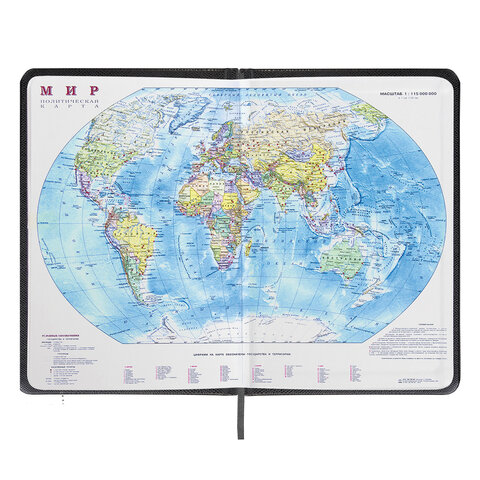 Внутренний блок включает 168 листов тонированной бумаги плотностью 70 г/м2. Каждая страничка имеет перфорированный угол. Благодаря стандартному формату А5 (138х213 мм) ежедневник удобно использовать как в офисе, так и на выездных деловых встречах. Твердая обложка стилизована под кожу рептилии классического черного цвета. Подходит для горячего тиснения. Срез ежедневника фольгирован золотой фольгой, что придает ему особый шарм. Форзац ежедневника представлен картами мира и России. Дополнением является закладка-ляссе, с помощью которой при необходимости можно быстро открыть ежедневник на нужной странице. Помимо прочего, ежедневник снабжен обширным справочным материалом.