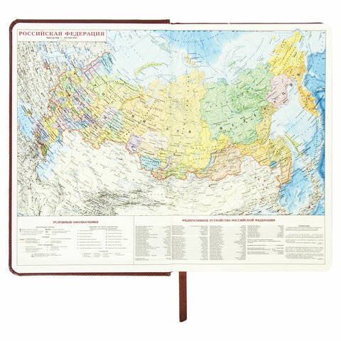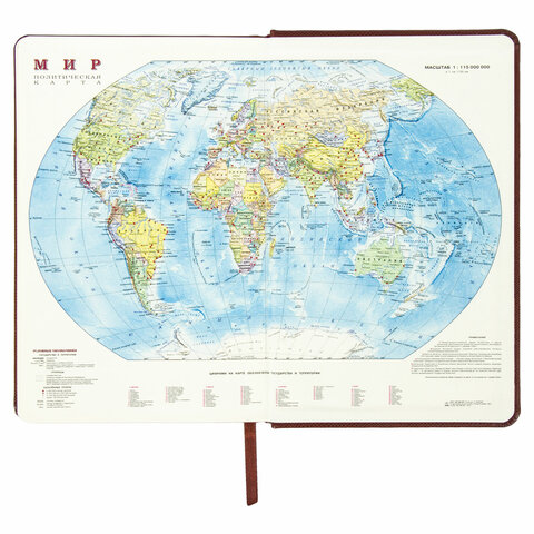 Внутренний блок включает 168 листов тонированной бумаги плотностью 70 г/м2. Каждая страничка имеет перфорированный угол. Благодаря стандартному формату А5 (138х213 мм) ежедневник удобно использовать как в офисе, так и на выездных деловых встречах. Твердая обложка стилизована под кожу рептилии классического коричневого цвета. Подходит для горячего тиснения. Срез ежедневника фольгирован золотой фольгой, что придает ему особый шарм. Форзац ежедневника представлен картами мира и России. Дополнением является закладка-ляссе, с помощью которой при необходимости можно быстро открыть ежедневник на нужной странице. Помимо прочего, ежедневник снабжен обширным справочным материалом.
