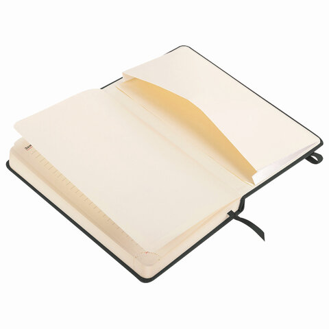 Внутренний блок включает 168 листов кремовой бумаги плотностью 70 г/м2. Каждая страничка имеет перфорированный угол. Благодаря стандартному формату А5 (138х213 мм) ежедневник удобно использовать как в офисе, так и на выездных деловых встречах, а резинка-фиксатор поможет избежать раскрытия ежедневника в сумке или портфеле. Твердая книжная обложка стилизована под гладкую кожу строгого черного цвета. Материал обложки подходит для горячего тиснения. Дополнением является закладка-ляссе, с помощью которой при необходимости можно быстро открыть ежедневник на нужной странице. Помимо прочего, ежедневник снабжен обширным справочным материалом.