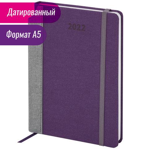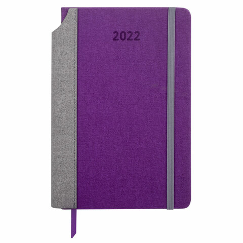 Внутренний блок включает 168 листов белой бумаги плотностью 70 г/м2. Каждая страничка имеет перфорированный угол. Благодаря стандартному формату А5 (138х213 мм) ежедневник удобно использовать как в офисе, так и на выездных деловых встречах. Жесткая книжная обложка стилизована под искусственную кожу с текстурой льна, фиксируется резинкой, поэтому ежедневник не откроется в сумке или портфеле и страницы не помнутся. Материал обложки подходит для горячего тиснения. Для удобства пользования ежедневник снабжен клапаном для фиксации ручки. Форзац ежедневника представлен картами мира и России. Дополнением является закладка-ляссе, с помощью которой при необходимости можно быстро открыть ежедневник на нужной странице. Помимо прочего, ежедневник снабжен обширным справочным материалом. Выполнен в стильном сочетании фиолетового и серого цветов.